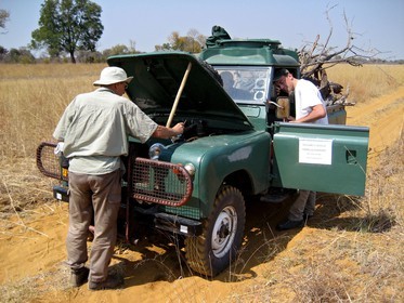 Volonteers trying to repare the overheating car in the bush of the Hwange Park *** Des volontaires essayant de reparer la voiture ayant trop chauffee au milieu du park Hwange