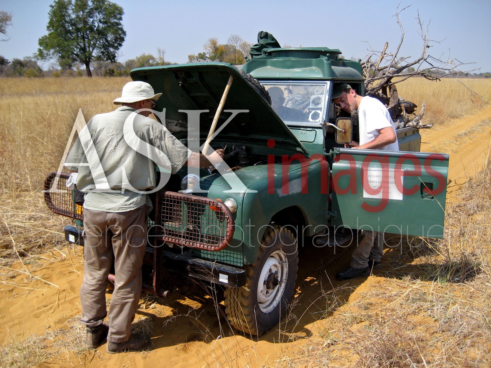 | Description | Volonteers trying to repare the overheating car in the bush of the Hwange Park *** Des volontaires essayant de reparer la voiture ayant trop chauffee au milieu du park Hwange |