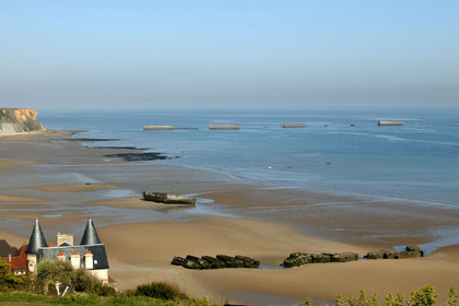 La plage d'Arromanches, et les caissons qui gissent a maree basse en arc de cercle sur 8km montrent l'ampleur de ce qu'etait "Mulberry B", poumon qui a des les premiers jours permis de ravitailler les troupes parvenues a prendre les cotes normandes d'assaut.