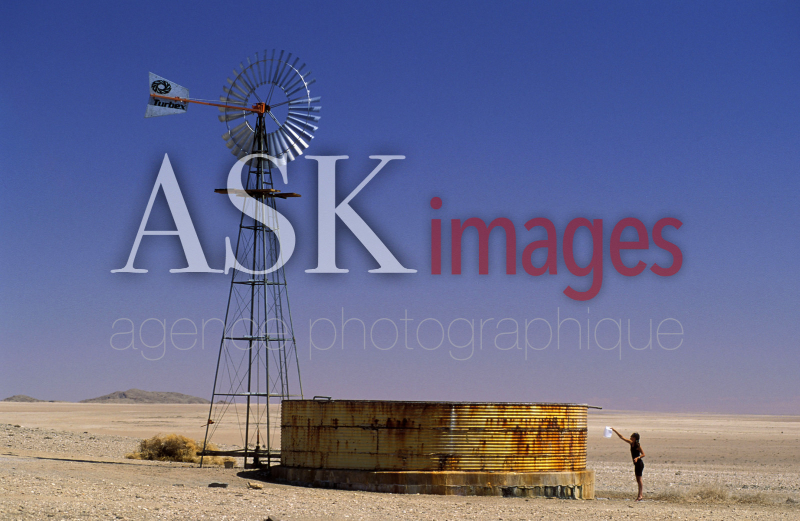 | Description | Reserve d'eau et eolienne dans le desert du Namib, parc national du Naukluft Namibie. *** Water pumping windmill in Namib desert, Naukluft national park Namibia. |