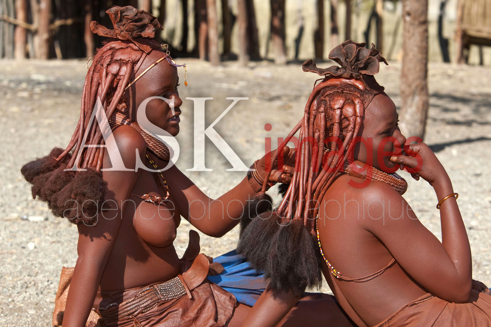 DescriptionLES HIMBA sont un peuple de pasteurs nomades de Namibie. Ils se parent volontiers de colliers en cuir et d'anneaux en laiton et enduisent leur peau d'une pate a base de beurre et de bois rouge . Les jeunes filles portent deux nattes epaisses, tressees vers l'avant du visage et redressees au dessus du front telles des cornes *** THE HIMBA are a nomadic people of Namibia. They adorn themselves with leather collars and brass rings and coat their skin with a paste made of butter and red wood. Girls wear two thick plaits, braided forward face and straightened above the forehead like horns, Namibia.
