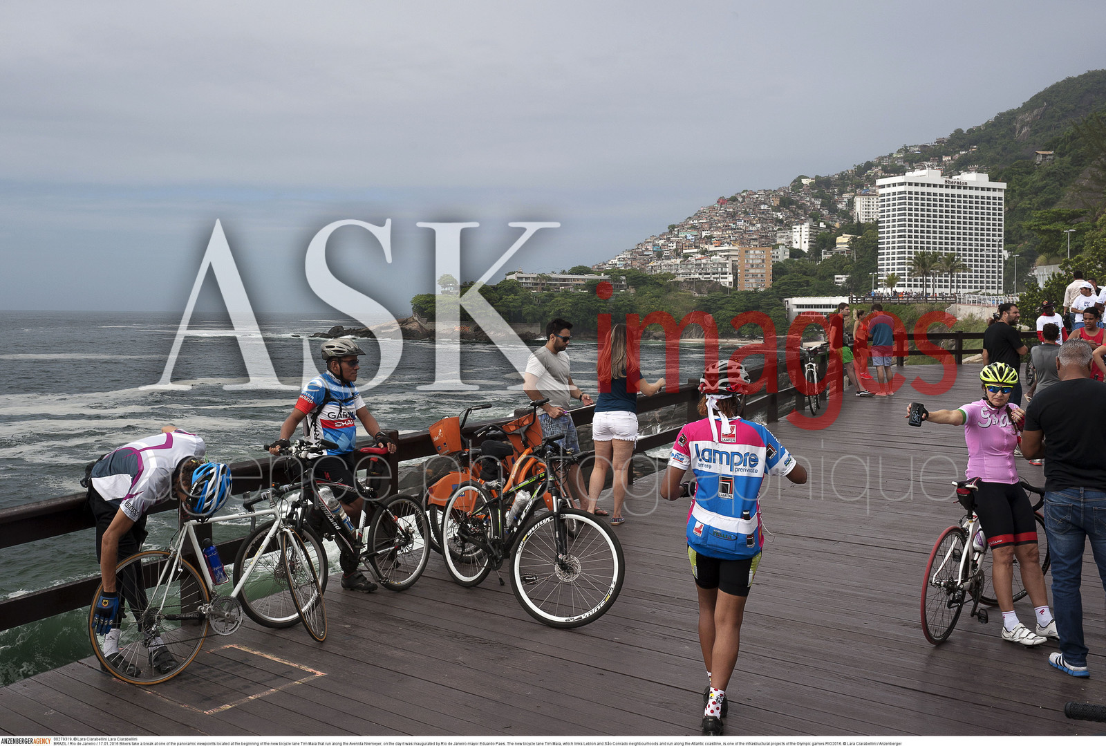 DescriptionBRAZIL / Rio de Janeiro / 17.01.2016..Bikers take a break at one of the panoramic viewpoints located at the beginning of the new bicycle lane Tim Maia that run along the Avenida Niemeyer, on the day it was inaugurated by Rio de Janeiro mayor Eduardo Paes. The new bicycle lane Tim Maia, which links Leblon and S„o Conrado neighbourhoods and run along the Atlantic coastline, is one of the infrastructural projects of the Olympic games RIO2016...© Lara Ciarabellini / Anzenberger