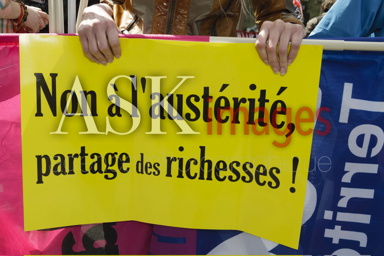 | Description | Defile du 1er mai sur fond de pacte de responsabilite - le 01-05-2014 *** May 1st demonstration, Saint-Etienne, France. |
