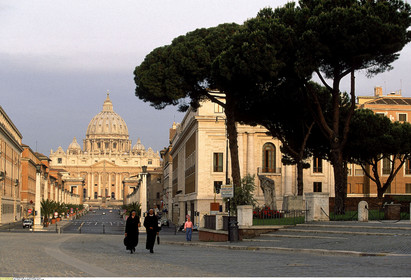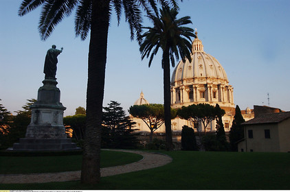 VATICAN CITY STATE-ROME,THE VATICAN GARDENS: SAN PETER DOME VIEW FROM THE VATICAN GARDENS, WITH SAN PETER STATUE. . THE VATICAN GARDENS