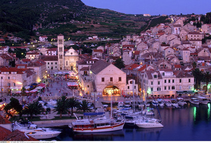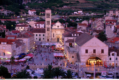 Croatia / Dalmatia / Hvar / Hvar Town / View across Hvar Town with Cathedral and Arsenal at dusk..© Oliver Bolch / Anzenberger Croatia