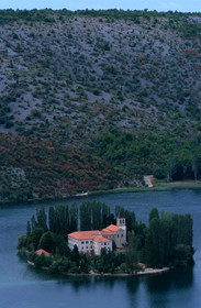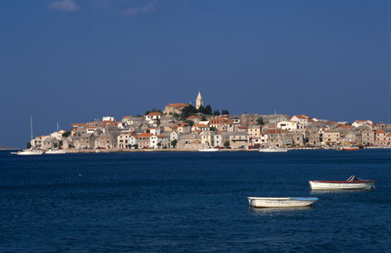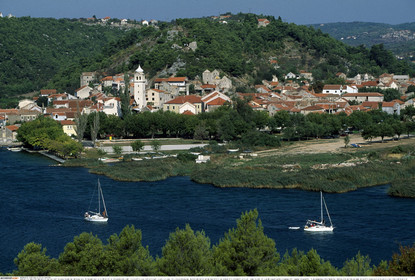 CROATIA / Dalmatia / Krka National Park / sailing along the Krka river. Skradin city in the background. The Sibenik region is one of the Mediterranean's quieter corners where there is still the space and time to make discoveries in a fascinating and varied landscape. The Krka National Park and the town of Sibenik are symbolic of the contrasts that are found in central Dalmatia. There are the rugged limestone mountains of the mainland set against the intricate archipelagos of the Adriatic Sea. And there is the diversity and natural beauty of the various parks and reserves in combination with the rich and well-preserved cultural heritage of the ancient coastal settlements. It is a landscape that offers much to the interested visitor and which, thankfully, remains free from the concrete development of resorts..© Fausto Giaccone / Anzenberger. Croatia- Dalmatia islands