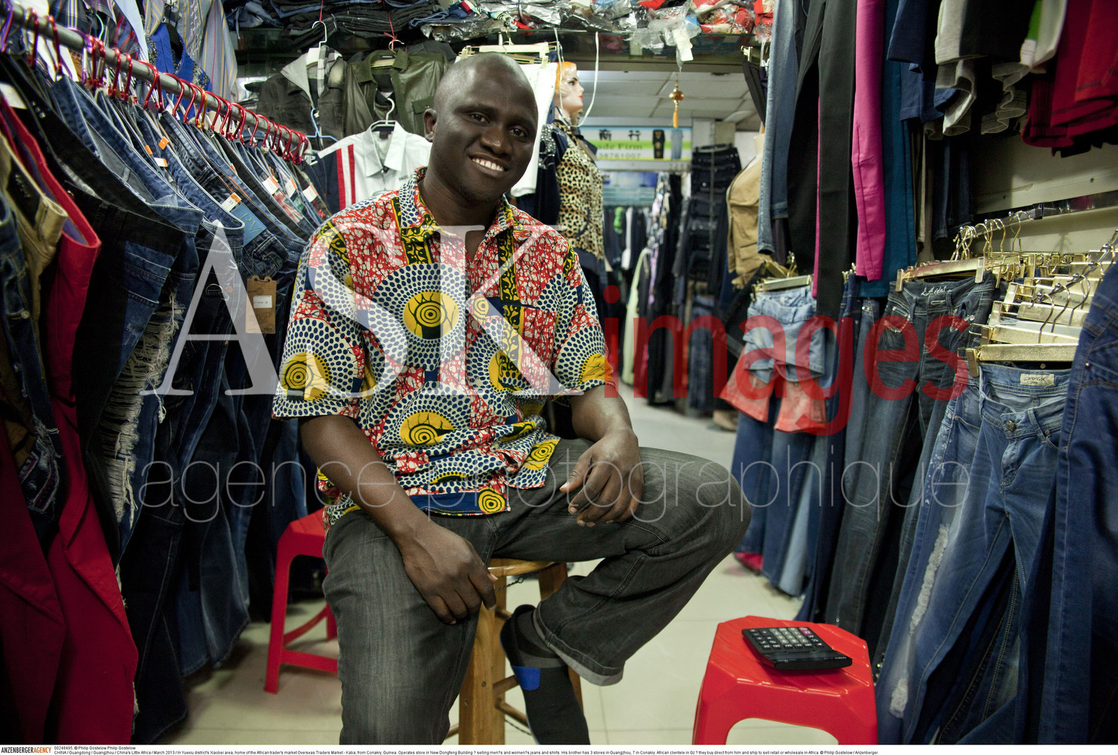 | Description | CHINA / Guangdong / Guangzhou / China's Little Africa / .In Yuexiu district's Xiaobei area, home of the African trader's market Overseas Traders Market - Kaba; from Conakry, Guinea. Operates store in New Dongfeng Building ? selling men?s and women?s jeans and shirts. His brother has 3 stores in Guangzhou, 7 in Conakry. African clientele in Gz ? they buy direct from him and ship to sell retail or wholesale in Africa...© Philip Gostelow / Anzenberger |
