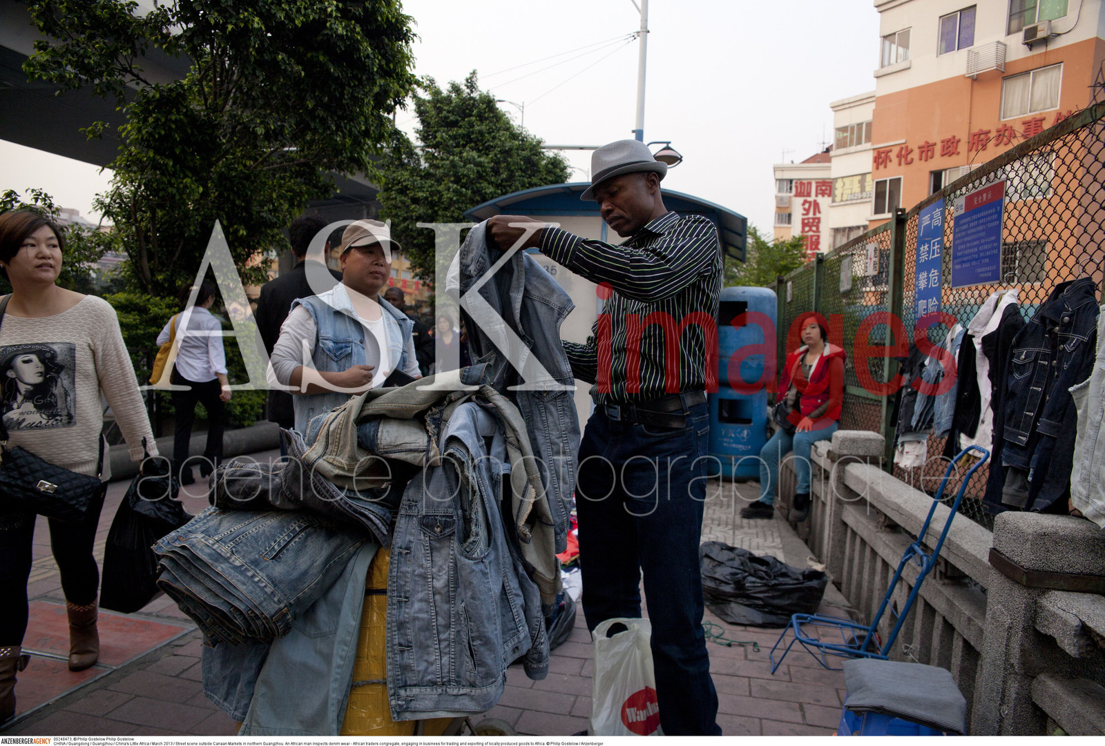 DescriptionCHINA / Guangdong / Guangzhou / China's Little Africa / .Street scene outside Canaan Markets in northern Guangzhou. An African man inspects denim wear - African traders congregate, engaging in business for trading and exporting of locally produced goods to Africa...© Philip Gostelow / Anzenberger