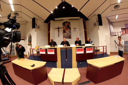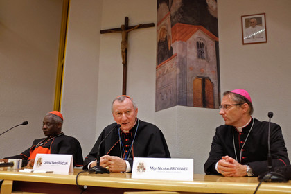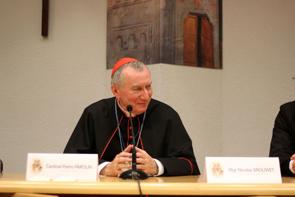CONFERENCE DE PRESSE POUR LA FETE DE NOTRE DAME DE LOURDES, DE MONSEIGNEUR PIETRO PAROLIN, SECRETAIRE D ETAT DU VATICAN, CARDINAL DE L EGLISE CATHOLIQUE, LOURDES, HAUTES PYRENEES, OCCITANIE, FRANCE, EUROPE