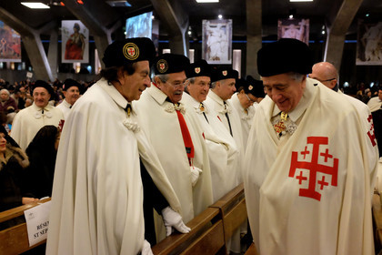 L ORDRE EQUESTRE DE SAINT SEPULCRE DE JERUSALEM PENDANT LA MESSE INTERNATIONALE DE MONSEIGNEUR PIETRO PAROLIN, CARDINAL DE L EGLISE CATHOLIQUE ET SECRETAIRE D ETAT DU VATICAN, EN LA BASILIQUE SAINT PIE X, LOURDES, HAUTES PYRENEES, OCCITANIE, FRANCE, EUROPE