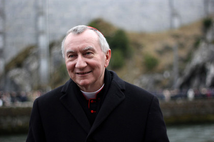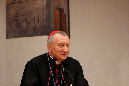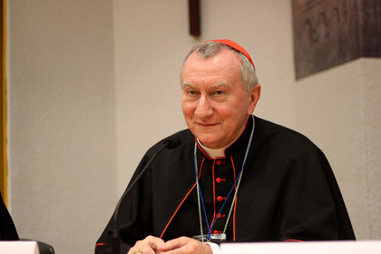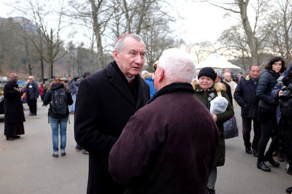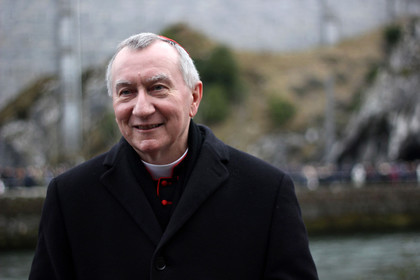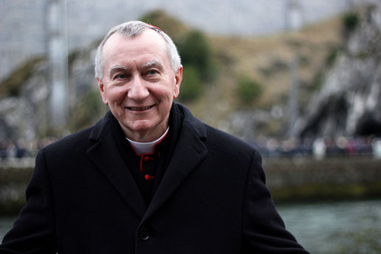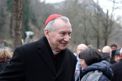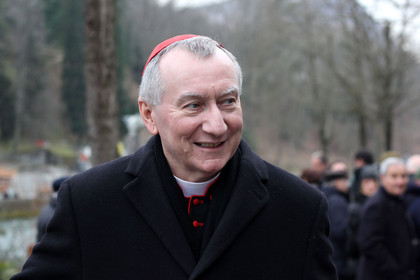 APRES LA CONFERENCE DE PRESSE POUR LA FETE DE NOTRE DAME DE LOURDES, MONSEIGNEUR PIETRO PAROLIN, SECRETAIRE D ETAT DU VATICAN, CARDINAL DE L EGLISE CATHOLIQUE SORT VOIR LES PELERINS SUR LE PARVIS DE NOTRE DAME DE LOURDES, LOURDES, HAUTES PYRENEES, OCCITANIE, FRANCE, EUROPE