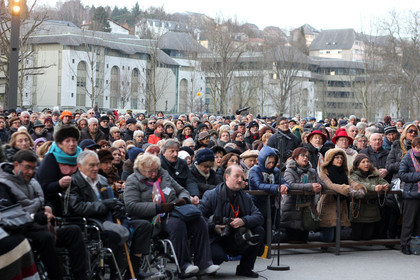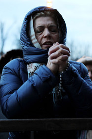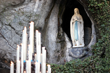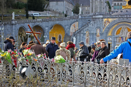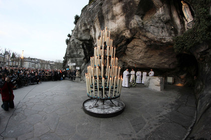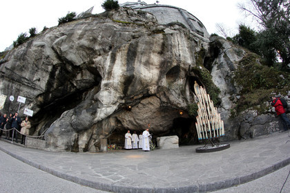 PELERINS PRIANT A LA GROTTE BERNADETTE SOUBIROUS PENDANT LE CHAPELET EN ITALIEN DE MONSEIGNEUR PIETRO PAROLIN, LOURDES, HAUTES PYRENNES, OCCITANIE, FRANCE, EUROPE