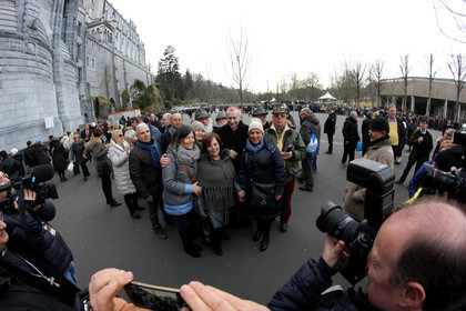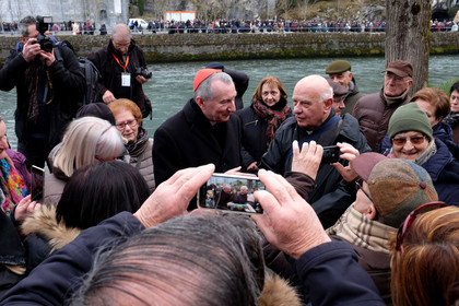 APRES LA CONFERENCE DE PRESSE POUR LA FETE DE NOTRE DAME DE LOURDES, DE MONSEIGNEUR PIETRO PAROLIN, SECRETAIRE D ETAT DU VATICAN, CARDINAL DE L EGLISE CATHOLIQUE, DE NOMBREUX PELERINS VIENNENT LE VOIR POUR LA BENEDICTION ET LUI SERRER LA MAIN, LOURDES, HAUTES PYRENEES, OCCITANIE, FRANCE, EUROPE