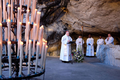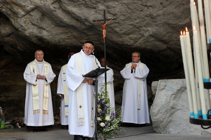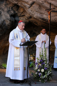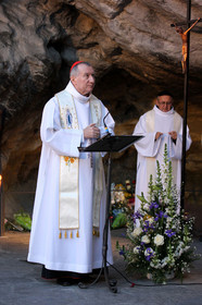 MONSEIGNEUR PIETRO PAROLIN, CARDINAL DE L EGLISE CATHOLIQUE ET SECRETAIRE D ETAT DU VATICAN, REALISE LE CHAPELET EN ITALIEN A LA GROTTE BERNADETTE SOUBIROUS , LOURDES, HAUTES PYRENEES, OCCITANIE, FRANCE, EUROPE