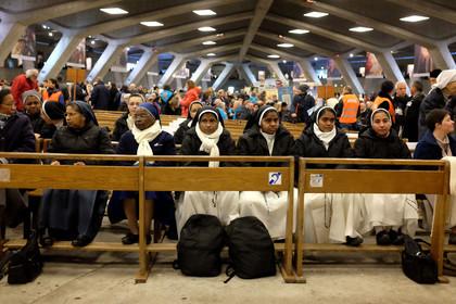 LES SOEURS ASSISES ATTENDENT LA MESSE DU CARDINAL PIETRO PAROLIN, SECRETAIRE DU VATICAN, A LA BASILIQUE SAINT PIE X DE LOURDES, LOURDES, HAUTES PYRENEES, OCCITANIE, FRANCE, EUROPE