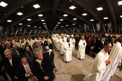 MONSEIGNEUR PIETRO PAROLIN, CARDINAL DE L EGLISE CATHOLIQUE ET SECRETAIRE D ETAT DU VATICAN, REALISE LA MESSE INTERNATIONALE EN LA BASILIQUE SAINT PIE X, ICI ENTOURE DES EVEQUES ET ARCHEVEQUES, LOURDES, HAUTES PYRENEES, OCCITANIE, FRANCE, EUROPE