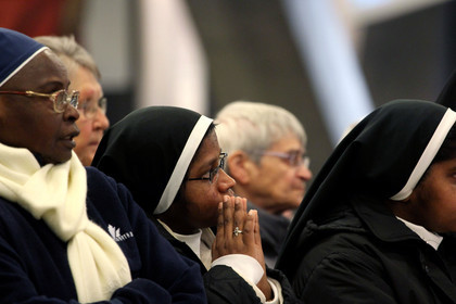 PRIERE DES SOEURS PENDANT LA MESSE INTERNATIONALE CELEBREE PAR MONSEIGNEUR PIETRO PAROLIN, CARDINAL DE L EGLISE CATHOLIQUE ET SECRETAIRE D ETAT DU VATICAN, EN LA BASILIQUE SAINT PIE X, LOURDES, HAUTES PYRENEES, OCCITANIE, FRANCE, EUROPE