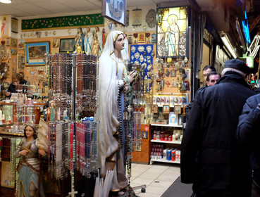 A LOURDES, UN TRES GRAND NOMBRE DE MAGASINS OFFRE LA POSSIBILITE AUX PELERINS DE REMPORTER CHEZ EUX DES SOUVENIRS, DEDIE A LA VIERGE MARIE, LOURDES, HAUTES PYRENEES, OCCITANIE, FRANCE, EUROPE