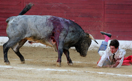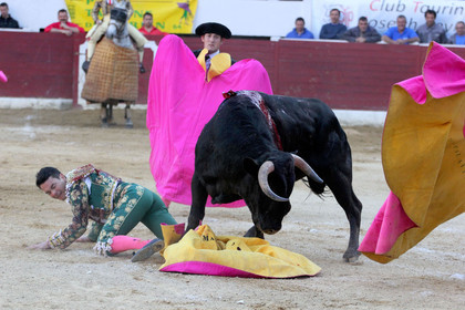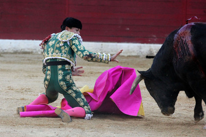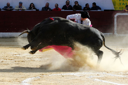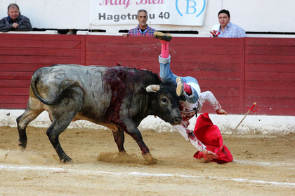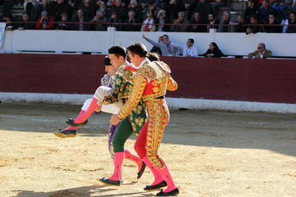 europe, france, aquitaine, landes, air sur l adour, les accidents peuvent etre tres violant comme ici avec le matador, alejandro conquero pendant les novilladas de la madeleine de aire sur l adour, le taureau lui est rentre litteralement dedans a plusieurs reprises, le matador fut conduit a l hopital