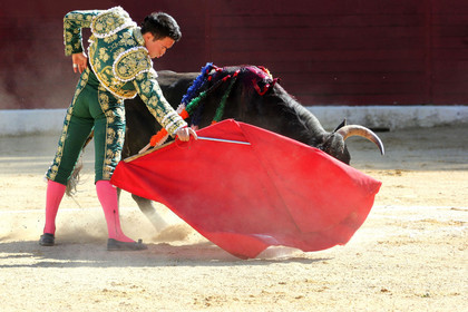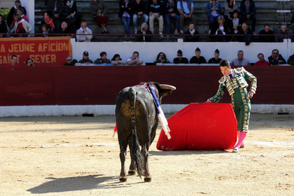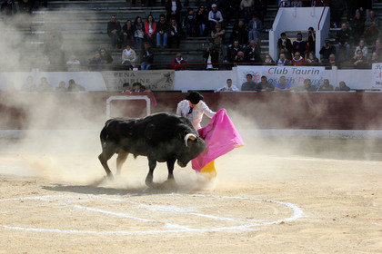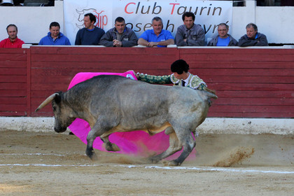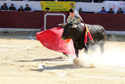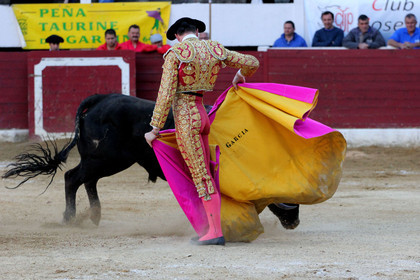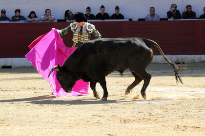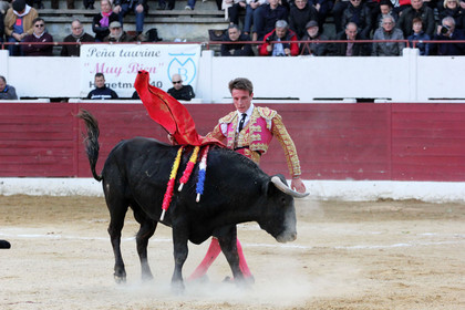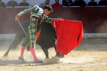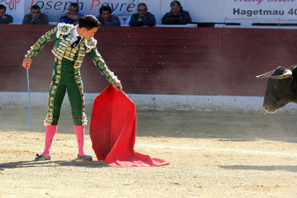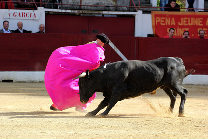 europe, france, aquitaine, landes, air sur l adour, le jeune matador, tibo garcia pendant les novilladas de la madeleine de aire sur l adour, qui realise des passes sur un taureau de trois ans qui pese tout de meme 500 Kg, les banderilles sont planter dans le taureau