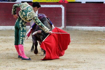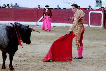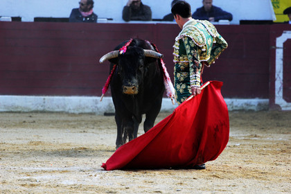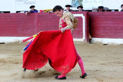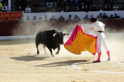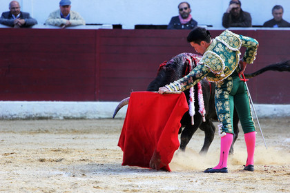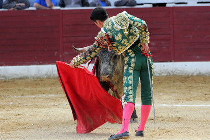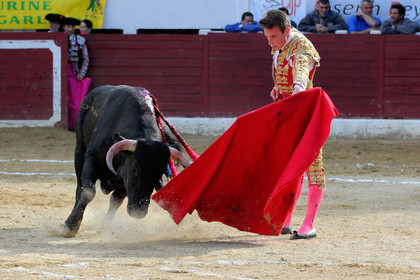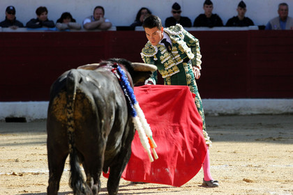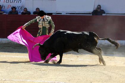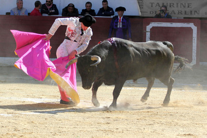 europe, france, aquitaine, landes, air sur l adour, le jeune matador, manolo vanegas pendant les novilladas de la madeleine de aire sur l adour, qui realise des passes sur un taureau de trois ans qui pese tout de meme 500 Kg, avant que les banderilleros piquent les banderilles
