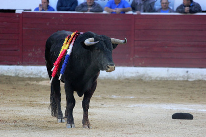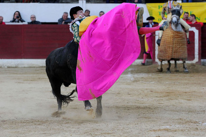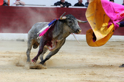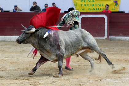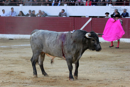 europe, france, aquitaine, landes, air sur l adour, le role du banderilleros est d etourdir la bete mais aussi de piquer les banderilles dans la zone de la croix du taureau, c'est a dire une zone de quelques centimËtres carrÈs situee a hauteur du garrot, entre la colonne vertÈbrale et l'omoplate droite