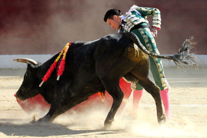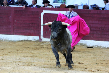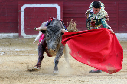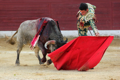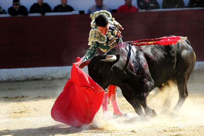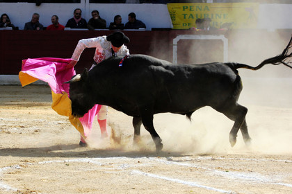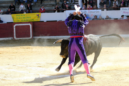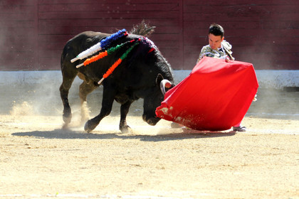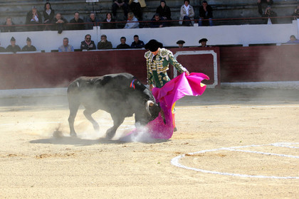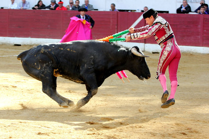 europe, france, aquitaine, landes, air sur l adour, le matador, alejandro consuero pendant les novilladas de la madeleine de aire sur l adour, qui realise des passes sur un taureau de trois ans qui pese tout de meme 500 Kg, les banderilles sont planter dans le taureau