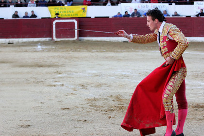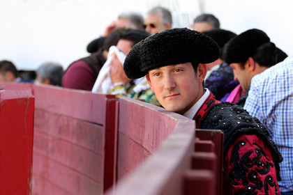 europe, france, aquitaine, landes, air sur l adour, le jeune matador, manolo vanegas pendant les novilladas de la madeleine de aire sur l adour, lance son chapeau en esperant qu il tombe a l endroit, le mauvais presage si il tombe a l envers