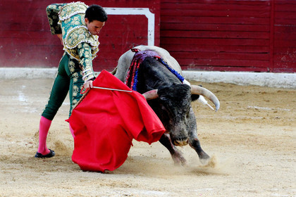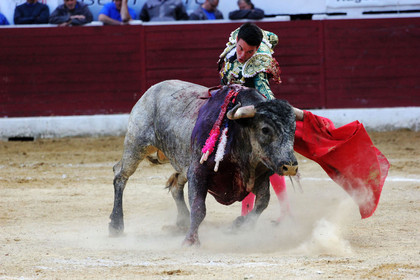 europe, france, aquitaine, landes, air sur l adour, le jeune matador, manolo vanegas pendant les novilladas de la madeleine de aire sur l adour, qui realise des passes sur un taureau de trois ans qui pese tout de meme 500 Kg, les banderilles sont planter dans le taureau