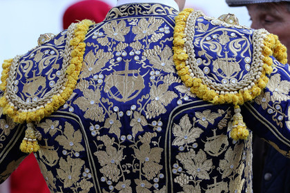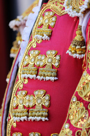 europe, france, aquitaine, landes, air sur l adour, un picador en habit de lumieres pose le capote de paseo recouvrant l epaule et le bras gauche, il est de coutume de porter se couvrant pour la parade du debut, ici le banderillero se prepare pour entree dans les arenes