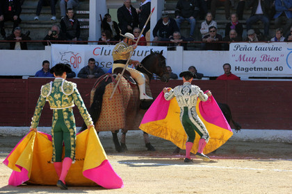 europe, france, aquitaine, landes, air sur l adour, le picador a un role crucial au debut de la rencontre, il doit affaiblir la bete avec sa lance qui transperce la bete sur 8.5 cm de profondeur en theorie, certaine rentre jusqu a 20 cm, historiquement les picadors etaient les aristocrates, les vrais stars des arenes et les matadors n etaient que les aides, aujourd hui leurs roles se sont inverses.