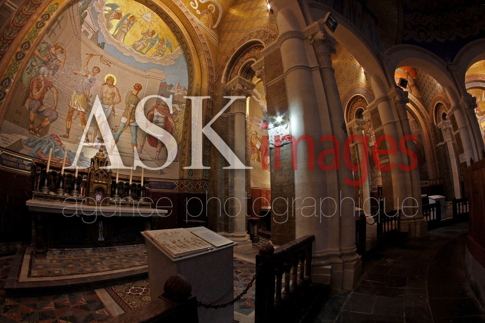 | Description | Europe, occitanie, hautes pyrenees, lourdes, basilique notre dame du rosaire, chapelles rayonnantes du choeur representant les mysteres douloureux qui sont tires de scenes de la Passion du Christ, la flagellation dessine par fournier en 1904. |