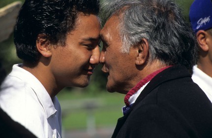 • Traditional greeting between 2 Maori men, 'Hongi', North Island, New Zealand.