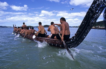 • Maori men learning how to drive a waka (Maori pirogue). Waitangi Day, North Island, New Zealand.