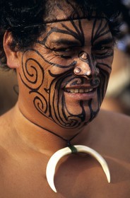 • Portrait of a Maori warrior with tattoo. New Moko, North Island, New Zealand.