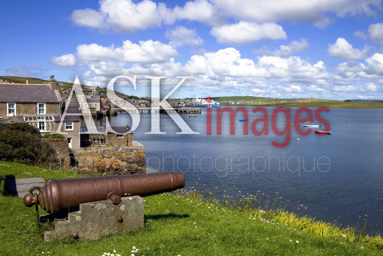 DescriptionStromness Orkney Scotland Cannon Gun Overlooking Hamnavoe Harbour Houses and Boats.