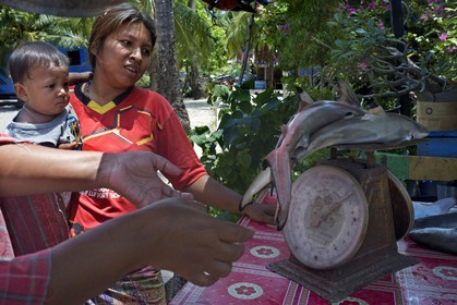 • Woman fish peddler. Fishing gypsy village. Koh Mook (Muk) is a small rocky island off the coast of Trang province, Thailand