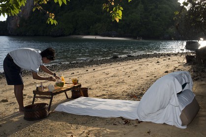 • Six Senses Resort, Koh Yao Noi, Phang Nga Bay, Thailand, Asia. Waitress preparing a sunrise Picnic breakfast on a deserted Island in Koh Hong archipelago.