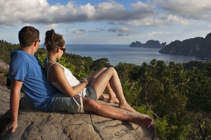 • Lovers in Pee Pee viewpoint Phi Phi Don island. Krabi province, Andaman Sea, Thailand. Ko Nok and Ton Sai Village from Ko Nai viewpoint, Ko Phi Phi, Thailand. Asia. Ko Phi Phi Don is the largest of the Phi Phi Islands, in Thailand.