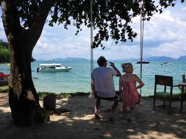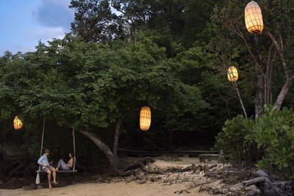 • A couple in a romantic swing in the beach of Six Senses Resort, Koh Yao Noi, Phang Nga Bay, Thailand, Asia.