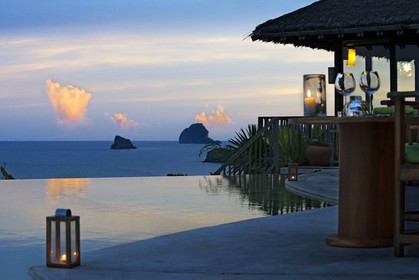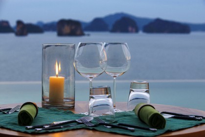 • Six Senses Resort, Koh Yao Noi, Phang Nga Bay, Thailand, Asia. Romantic table in the restaurant near the swimming pool called The Hilltop Reserve in front of the sea.