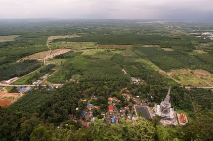 • Looking down from Buddhist shrine and statue on top of the mountain towards Tiger Cave Temple (Wat Tham Sua), Krabi, Thailand. The Tiger Cave Temple is a Buddhist temple located northeast of Krabi, Thailand.