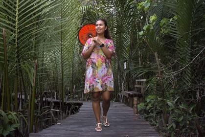 • Six Senses Resort, Koh Yao Noi, Phang Nga Bay, Thailand, Asia. Nice woman with umbrella in the garden.