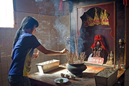 • Woman in prayer holding incense sticks, Temple complex in the Trang Buddhist Temple. Trang, also called Mueang Thap Thiang, is one of the southern provinces of Thailand