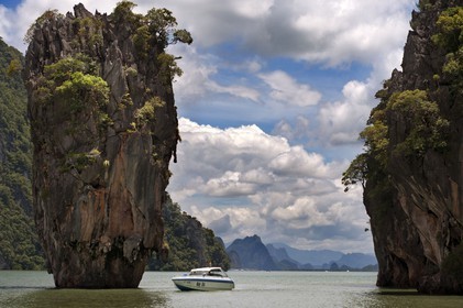 • James Bond Island 007 (Koh Tapu) Phang Nga Bay Thailand. Khao Phing Kan. Khao Phing Kan consists of two forest-covered islands with steep shores. They lie in the northwestern part of Phang Nga Bay, some 6 kilometres (3.7 mi) from the mainland, amid a group of a dozen of other islands.