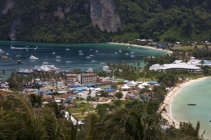 • Ko Nok and Ton Sai Village from Ko Nai viewpoint, Ko Phi Phi, Thailand. Asia. Pee Pee viewpoint Phi Phi Don island. Krabi province, Andaman Sea, Thailand. Ko Phi Phi Don is the largest of the Phi Phi Islands, in Thailand.