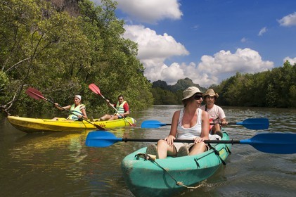 • People enjoy kayak padding through the mangrove forest and sea cave. SEAKAYAK BOR THOR. Krabi. Thailand. Asia. The north part of Krabi province boasts dramatic karst topography and abundance of cave.