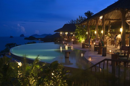 • Six Senses Resort, Koh Yao Noi, Phang Nga Bay, Thailand, Asia. Restaurant near the swimming pool called The Hilltop Reserve in front of the sea.