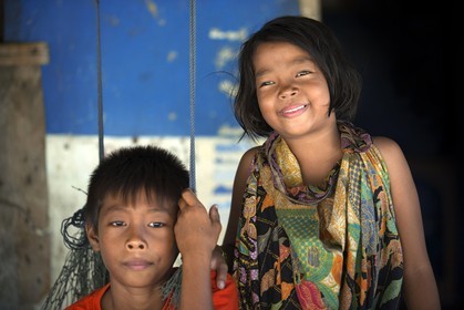 • Portrait of two children. Fishing gypsy village. Koh Mook (Muk) is a small rocky island off the coast of Trang province. On the east side, the island has a long sandy peninsula, Thailand