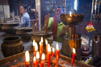 • People prayer with candles incense sticks, Temple complex in the Trang Buddhist Temple. Trang, also called Mueang Thap Thiang, is one of the southern provinces of Thailand